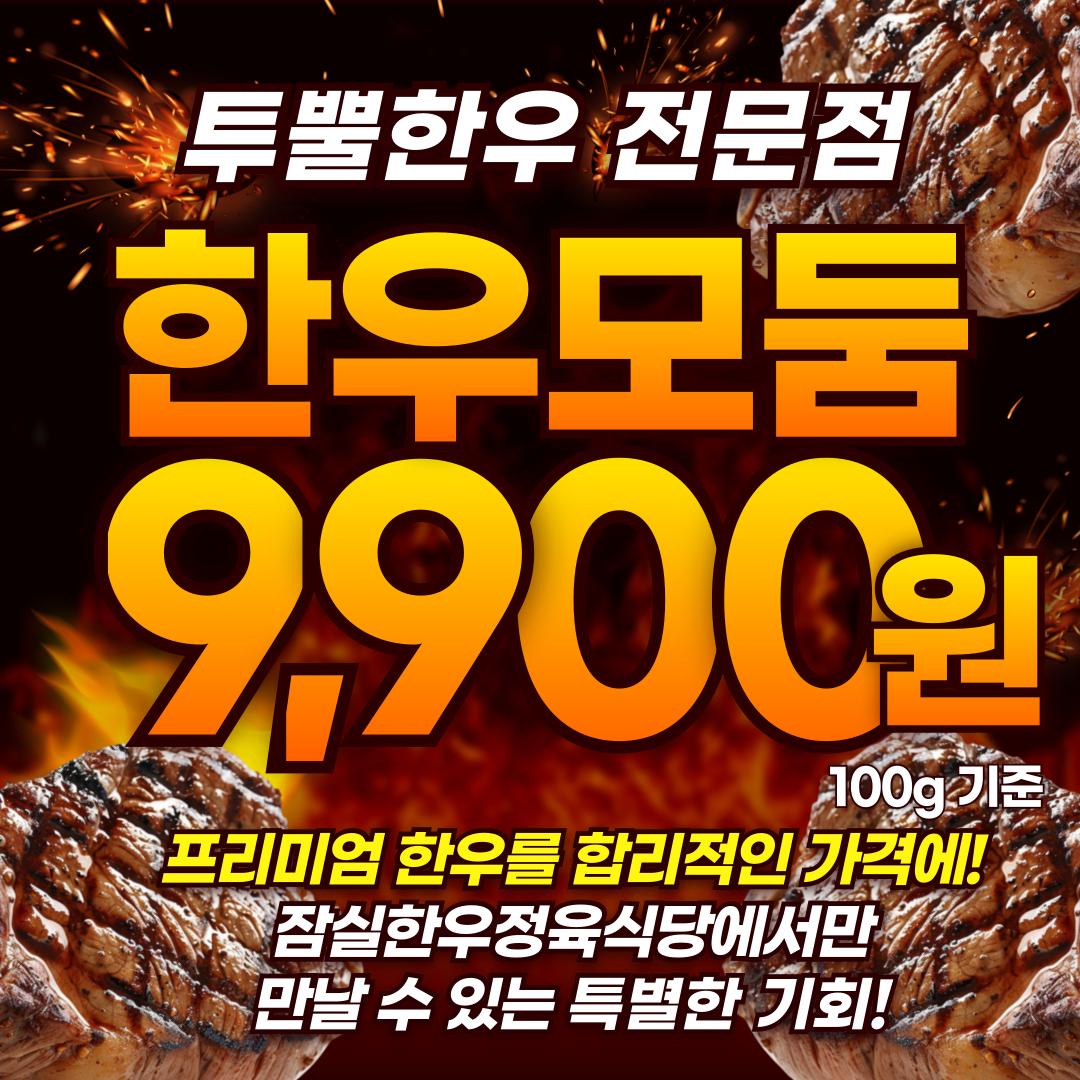 한우 모둠(100g) 9,900 | 한우 육회(100g) 9,900 | 칠백 한우 모둠(100g) 13,900 | 한우 육사시미(100g) 13,900 | 투뿔 한우 등심(100g) 13,900 | 칠백 한우 등심(100g) 15,900 | 한우 안심(100g) 13,900 | 한우 늑간살 (100g) 15,900 | 한우 살치살 (100g) 17,900 | 한우 포갈비(100g) 15,900 | 투뿔 한우 꽃등심 (100g) 17,900 | 투뿔 한우 채끝등심(100g) 16,900 | 투뿔 한우 알등심(100g) 16,900 | 한우 안심 샤또브리앙(100g) 16,900 | 한우 생갈비(100g) 19,900 | 한우 눈꽃 살치살(100g) 22,900 | 투뿔 한우 새우살(100g) 23,900 | 한우 안창살(100g) 23,900 | 콜키지프리 0 | 한우 국밥 9,000 | 한우 육회비빔밥 11,000 | 폭탄계란찜 6,000 | 얼큰 순두부찌개 7,000 | 할머니가 생각나는 구수한 된장찌개 7,000 | 한우 차돌 된장찌개 11,000 | 새콤달콤 물냉면 7,000 | 매콤달콤 비빔냉면 7,000 | 상차림비 3,000 | 백세주 10,000 | 일품진로 30,000 | 화요 30,000 | 토닉워터 2,000 | 테라 5,000 | 캘리 5,000 | 참이슬 5,000 | 처음처럼 5,000 | 새로 5,000 | 진로 5,000 | 펩시제로콜라 2,000 | 칠성사이다 2,000 | 코카콜라 2,000