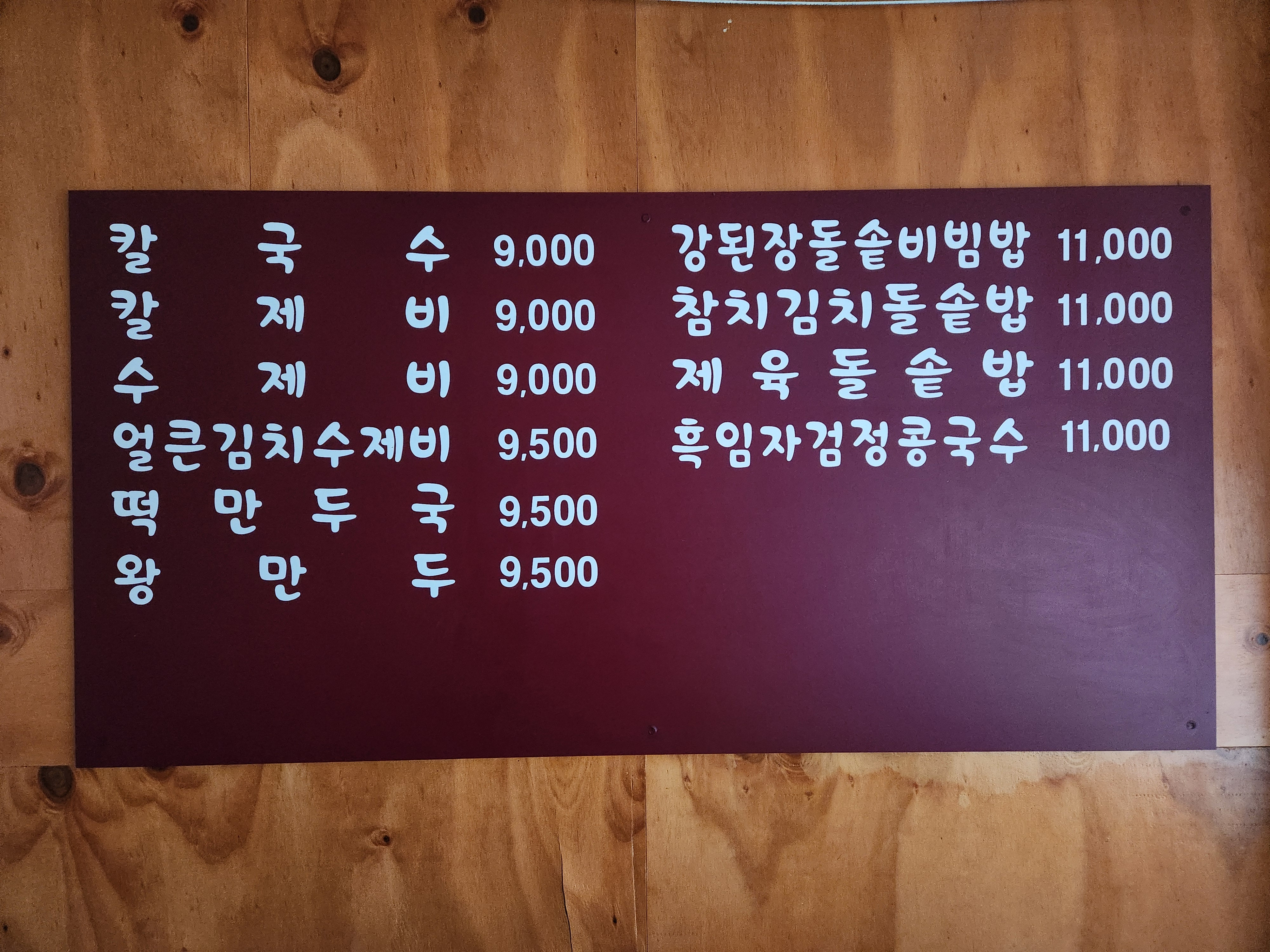 칼국수 9,000 | 칼제비 9,000 | 수제비 9,000 | 얼큰김치수제비 9,500 | 떡만두국 9,500 | 왕만두 9,500 | 강된장돌솥비빔밥 11,000 | 참치김치돌솥밥 11,000 | 제육돌솥밥 11,000 | 흑임자 검정콩국수 11,000