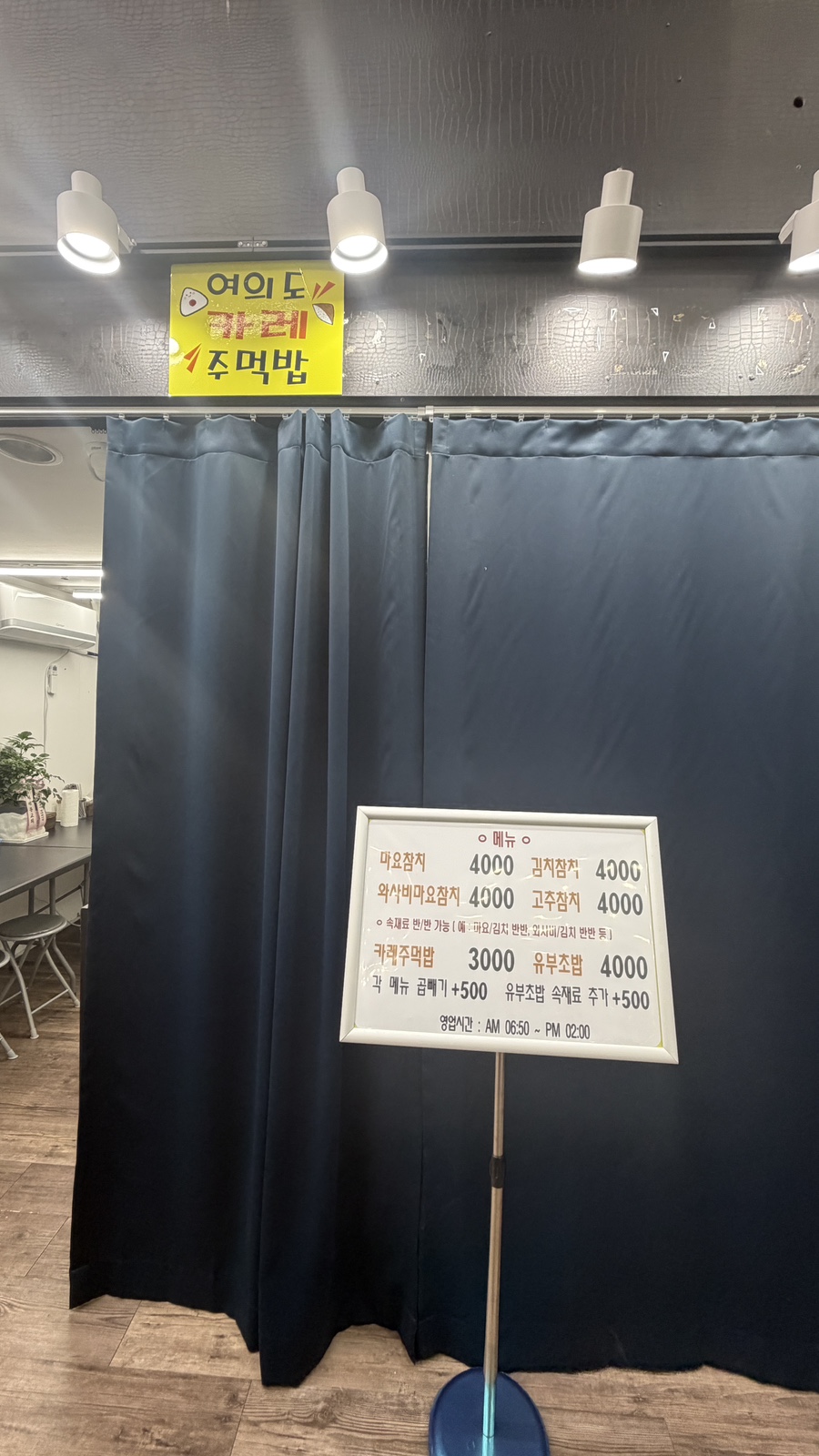 카레주먹밥 3,000 | 카레유부초밥 4,000 | 와사비마요참치 4,000 | 고추참치 4,000 | 김치참치 4,000 | 마요참치 4,000