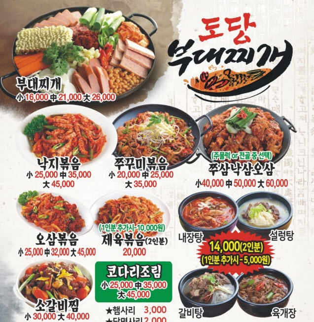 부대찌개 16,000 | 낙지볶음 25,000 | 쭈꾸미볶음 20,000 | 쭈삼낙삼오삼 40,000 | 오삼볶음 25,000 | 제육볶음2인분 20,000 | 내장탕2인분 14,000 | 설렁탕 2인분 14,000 | 갈비탕 2인분 14,000 | 육개장 2인분 14,000 | 소갈비찜 30,000 | 코다리조림 25,000