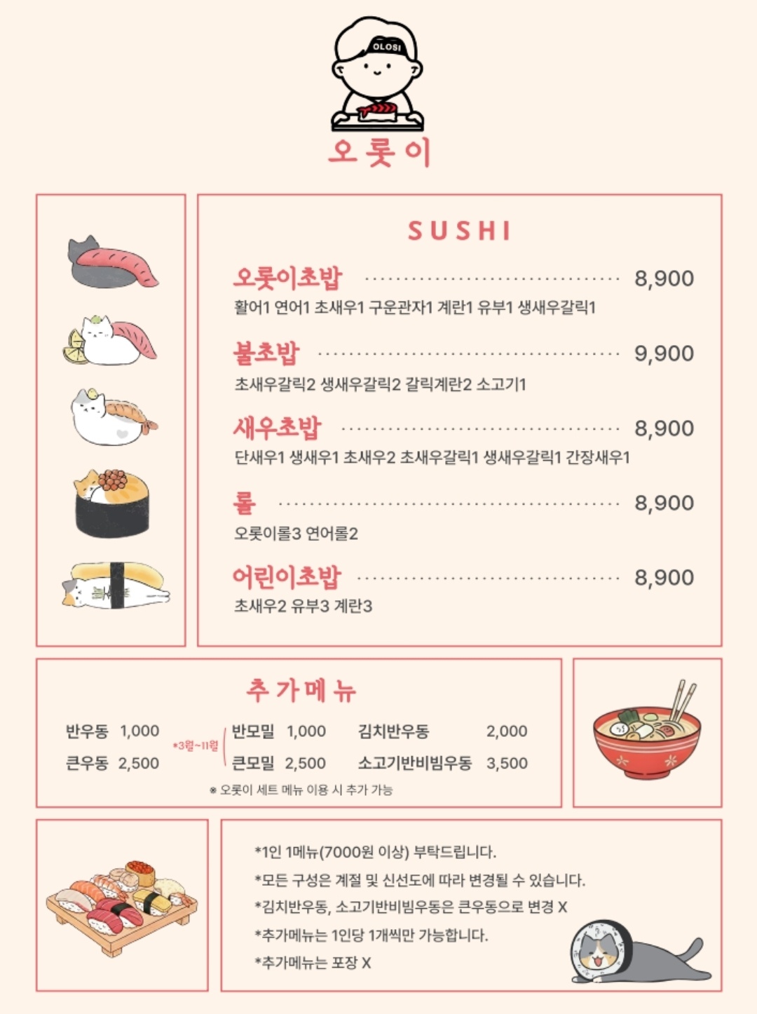 오롯이초밥 8,900 | 불초밥 9,900 | 새우만초밥 8,900 | 어린이초밥 8,900